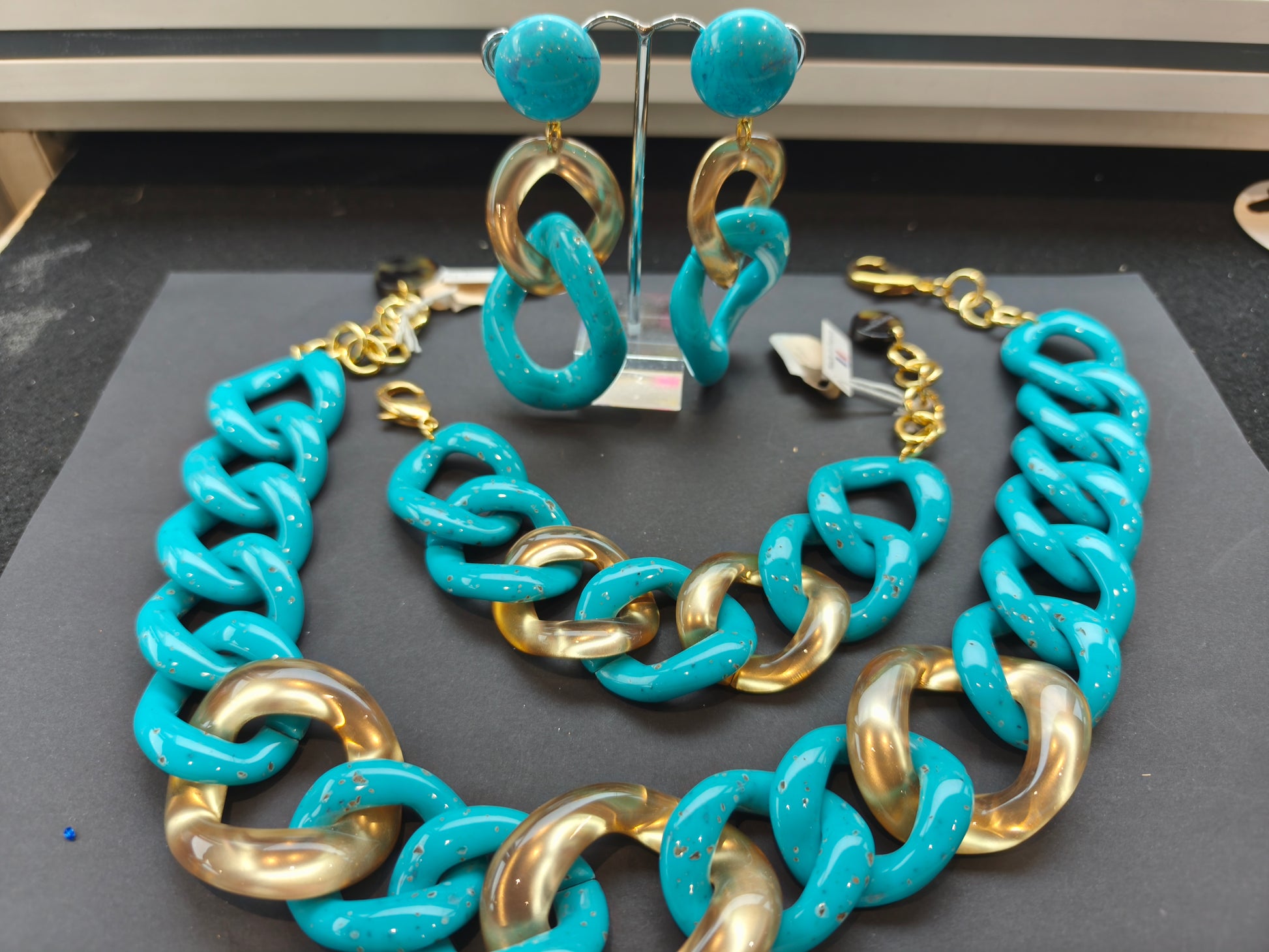 Ensemble maille en acétate de cellulose coloris turquoise et doré chaine acier inoxydable dorée